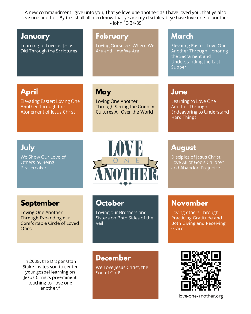 An outline of the structure of the initiative for 2025 is attached to this email and can also be found on the initiative’s website at www.love-one-another.org. You will see that each month includes a monthly theme, quote, several activity ideas, and an objective/call to action. You will see posters displayed in each of our meetinghouse lobbies, which will remind us of these monthly areas of focus. Each poster will have a QR code that members can scan to link electronically to the full yearly outline. We will also be providing monthly hard copy handouts that will contain many of the details of that month’s theme and area of focus. One of the key components of this initiative will be a weekly email/text of a scripture that has been specially selected to provide us with an example of people demonstrating love to one another, which will remind us of our obligation to love as Jesus did.